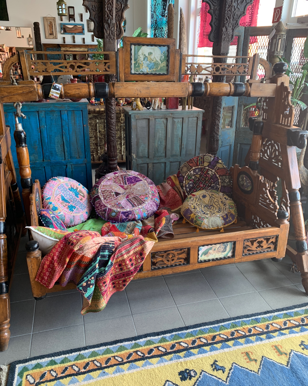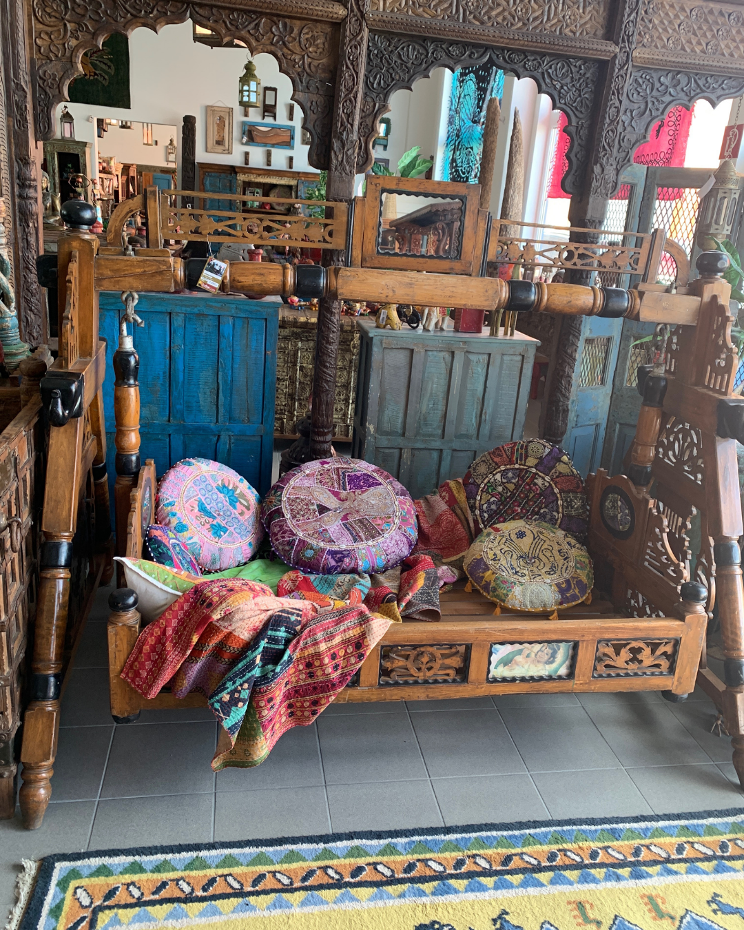 Entdecken Sie dieses einzigartige, handgeschnitzte Kinder-Schaukelbett aus massivem Holz. Ein wahres Unikat aus Indien, das mit viel Liebe zum Detail gefertigt wurde. Besonders hervorzuheben ist das drehbare Bild am Kopfteil, das entweder ein Spiegel oder ein zauberhaftes Krishna-Motiv zeigt. Dieses Schaukelbett vereint traditionelle indische Handwerkskunst mit praktischer Funktionalität und bringt ein Stück indischer Kultur in Ihr Zuhause.